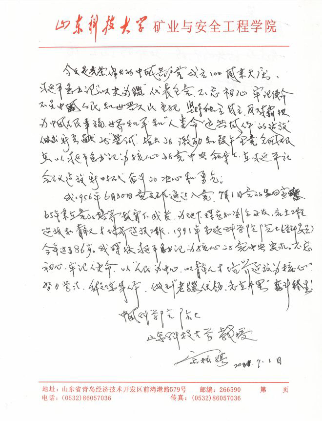 我1956年6月30日入党,在7月1日党的生日当天宣誓。65年来在党的培养教育下成长,为地下煤炭和资源开发、岩土工程建设和青年人才培养建设工作。1991年当选为科学院院士(学部委员),今年过了86岁。我将按以习近平同志为核心的党中央要求,不忘初心,牢记使命,以“人民为中心,以青年人才培养建设为核心”,努力学习,锻炼身体,做到“老骥伏枥,志在千里”,奋斗终生!