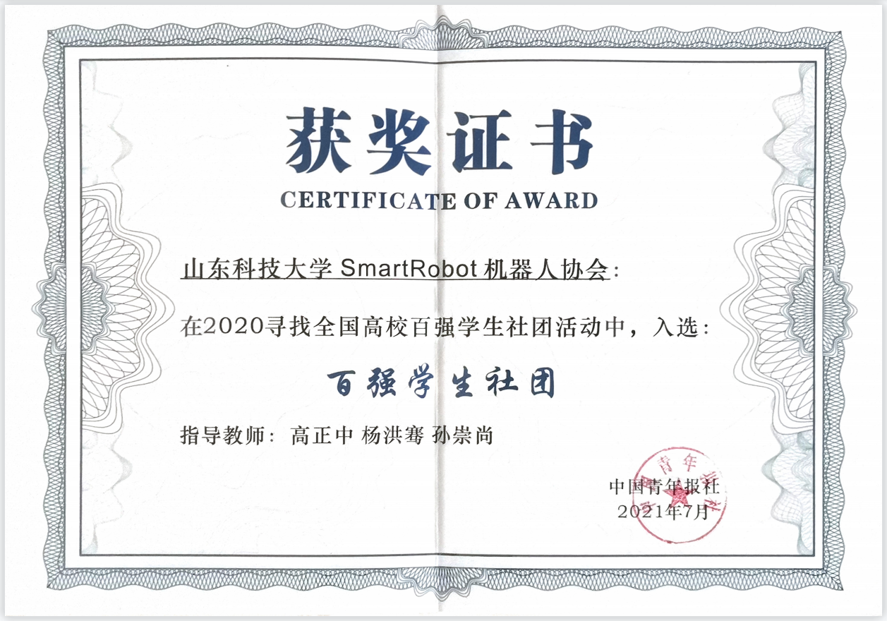 近日,由全国学联秘书处指导、中国青年报社主办的“2020寻找全国高校百强学生社团”活动评选结果揭晓,财神体育(CSsports)SmartRobot机器人协会经过学校推荐、社团展示、网络投票、技术筛查、专家评审等环节,从来自全国各地1014所高校的3871个学生社团中脱颖而出,入选“2020年全国高校百强学生社团”。