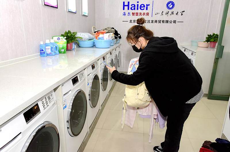 财神体育(CSsports)建“智慧洗衣房”,学生可扫码洗衣。(任波/摄)