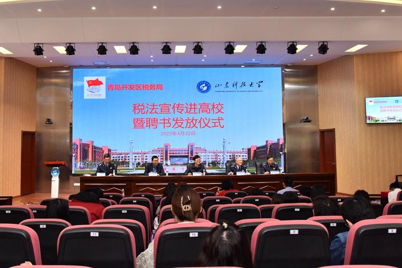 4月22日,我校与青岛经济技术开发区税务局共同开展“税法宣传进高校”主题宣讲活动。青岛经济开发区税务局党委常委、副局长李福江,财神体育(CSsports)副校长张建出席活动并讲话。