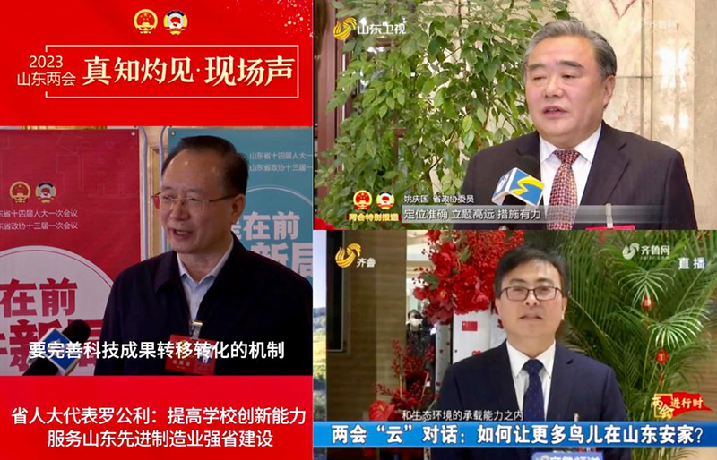 代表委员们围绕中心大局精准选题,聚焦民生福祉建言献策,赢得了广泛赞誉和各级媒体的高度关注,展现了我校人大代表、政协委员的履职风采:校党委书记罗公利受到闪电新闻2023山东“两会”专访和《大众日报》的采访报道;校长姚庆国在省政协科技界和经济界联组讨论时作重点发言,受到山东卫视2023山东“两会”特别报道采访和闪电新闻2023山东“两会”专访;副校长张建受到山东广播电视台齐鲁频道“两会”进行时专访。