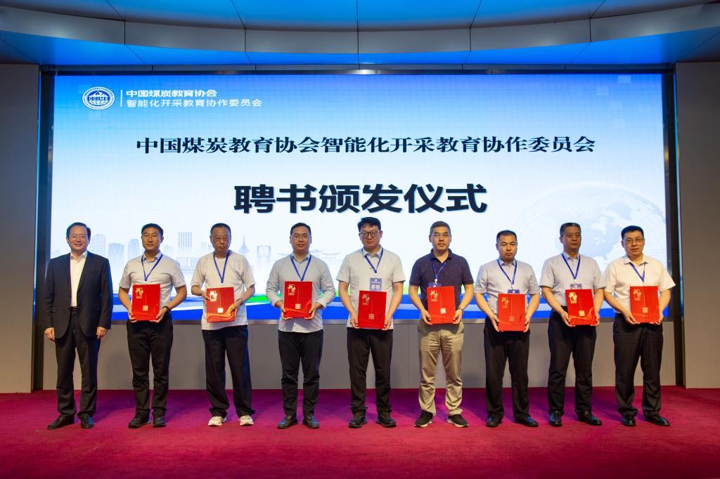 李增全与罗公利共同为智能化开采教育协作委员会揭牌,并分别为智能化开采教育协作委员会第一届委员会领导机构成员颁发聘书。