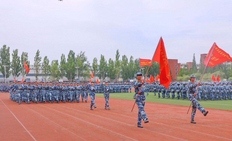 校党委书记罗公利宣布军训分列式开始。标兵就位后,19个军训营踏着《分列式进行曲》的节拍,迈出铿锵有力的步伐,以最饱满的状态先后接受检阅,充分展示训练成果。