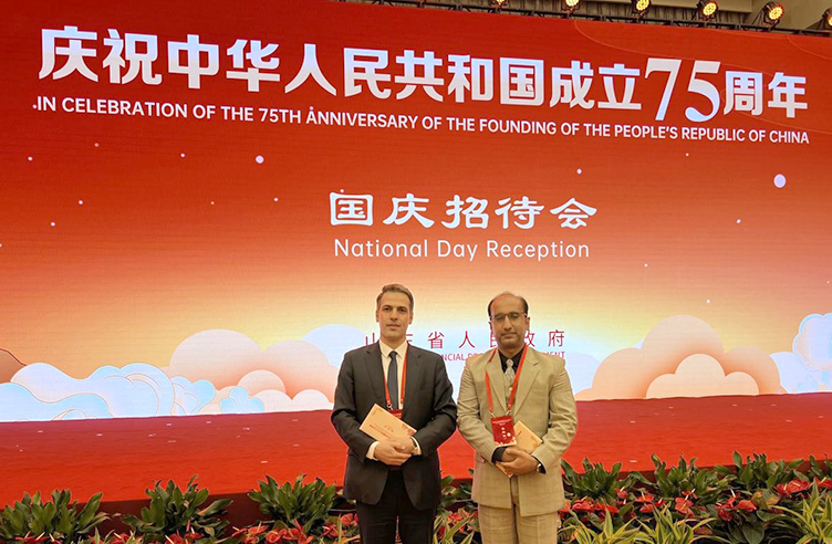 9月29日下午,山东省庆祝中华人民共和国成立75周年招待会在山东大厦金色大厅举行,省委书记林武出席并致辞,北部战区陆军中将司令员石正露出席,省委副书记、省长周乃翔主持,省政协主席葛慧君,正省级老同志韩寓群、陈光林,省人大常委会副主任、党组书记杨东奇出席。我校伊朗籍专家纳赛尔教授和巴基斯坦籍专家巴蒂副教授受邀参会。