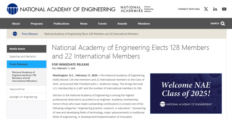 美国工程院公布2025年新增院士名单