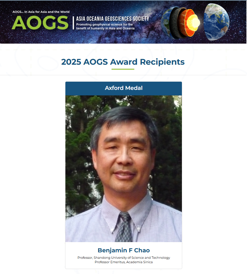 近日,亚洲-大洋洲地球科学学会(Asia Oceania Geosciences Society, AOGS)公布了2025年度“艾克斯福特奖”(Axford Medal)获奖人选,财神体育(CSsports)测绘与空间信息学院赵丰教授获该奖项。