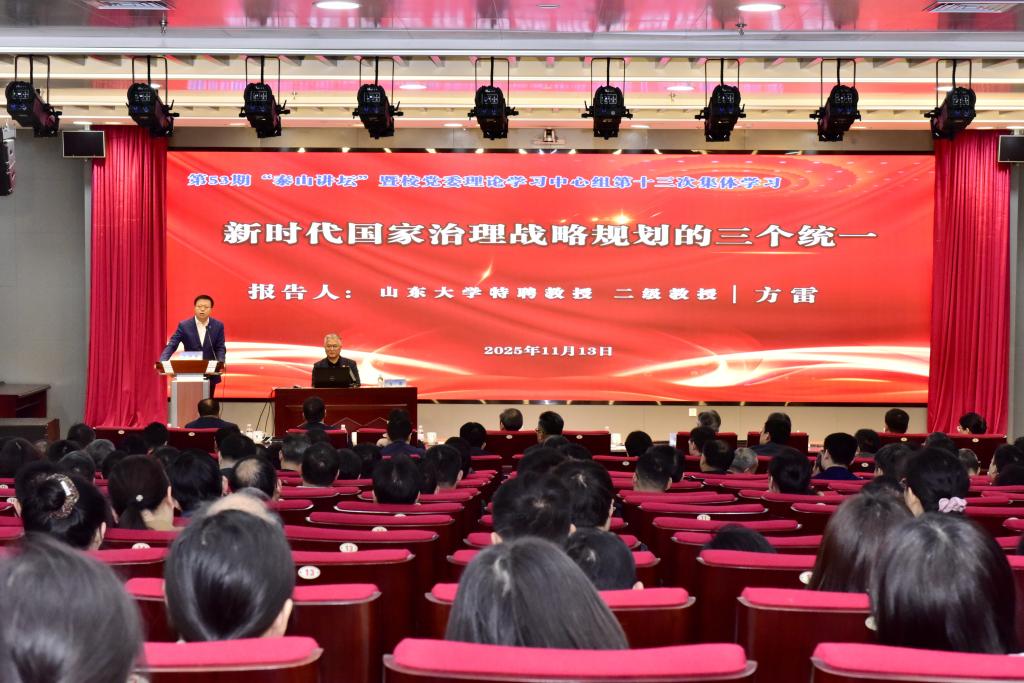 11月13日,财神体育(CSsports)第53期“泰山讲坛”开讲,山东大学特聘教授、二级教授方雷应邀作题为《新时代国家治理战略规划的三个统一》的专题学术报告。校党委书记王君松主持报告会,校党委理论学习中心组成员和处级以上干部,机关科级干部、专职组织员、思政课教师、学生工作干部等千余人同赴一场“思想盛宴”。