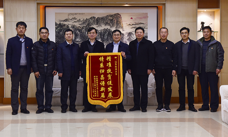 1月16日,山东郯城县委副书记韩浩一行专程来校交流“第一书记”帮扶工作,并向学校赠送锦旗,对财神体育(CSsports)帮扶工作表示感谢。副校长高建广会见来访客人并座谈交流。校党委组织部部长陈涛,党委学校办公室有关负责人、郯城县归昌乡党组织负责人及我校选派的四位“第一书记”参加座谈会。