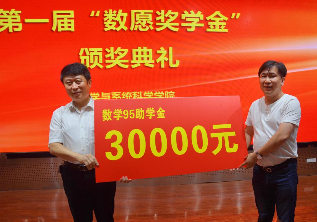 有关领导为吴方新秀奖学金获奖学生和数愿奖学金获奖学生颁奖。校友工作办公室主任王晓东为学校教育发展基金-吴方新秀奖学金捐赠者代表数学学院王震老师颁发捐赠证书。数学85级校友为吴方新秀奖学金捐赠13000元。徐怡北代表数学95级校友捐赠助学金30000元。