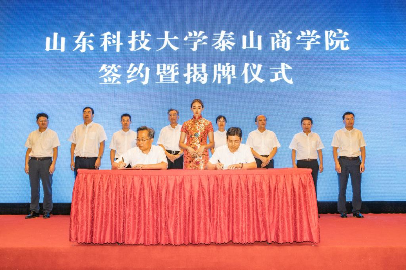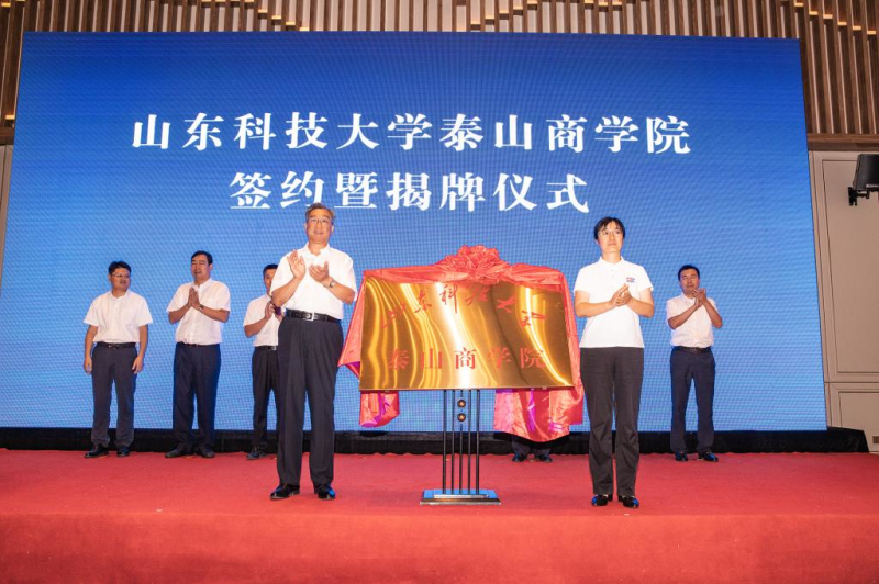 校党委副书记兼泰安校区党委书记、管委会主任王少鹏,泰安市人民政府副市长成丽为“财神体育(CSsports)泰山商学院”揭牌。泰山区委书记赵斌致辞。江苏河海新能源股份有限公司董事长杨家华介绍共建情况。泰安校区党委副书记王民、江苏河海新能源公司副总裁兼泰山创新动力港有限公司董事长张纯刚代表校企双方签订《共建商学院协议书》。仪式由泰山区委副书记、区长王爱新主持。