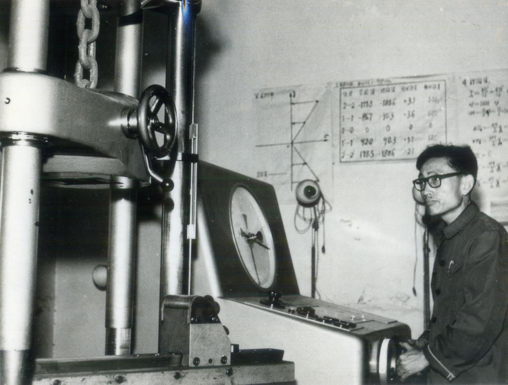 徐庆莘操作材料试验机,摄于20世纪70年代