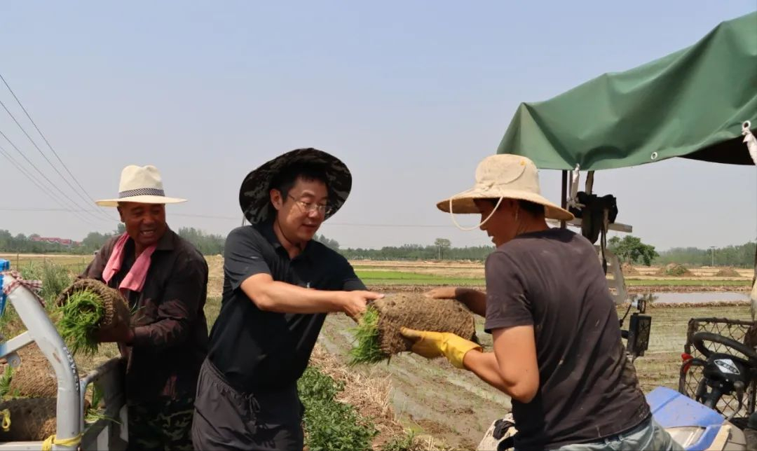 韩威(中)和村民在田间