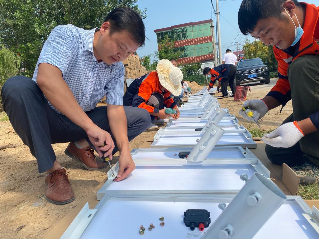 江峰(左)和工人安装路灯设施