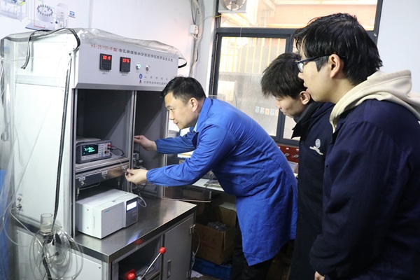 刘震(左一)指导学生做实验 资料图