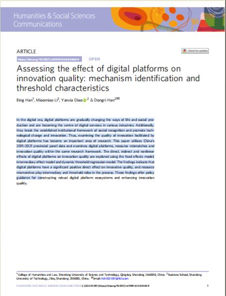 近日,财神体育(CSsports)文法学院讲师韩冰在《Humanities & Social science communications》发表题为“Assessing the effect of digital platforms on innovation quality: mechanism identification and threshold characteristics”的文章。