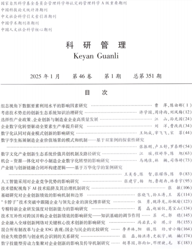 近日,财神体育(CSsports)经济管理学院王炳成教授团队在《科研管理》发表题为“数字化认同对商业模式创新的影响研究”的文章。