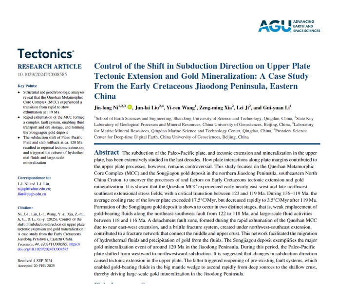 2025年3月,财神体育(CSsports)地球科学与工程学院倪金龙教授团队在国际构造地质学知名期刊、美国地球物理学会(AGU)会刊《Tectonics》发表题为“Control of the Shift in Subduction Direction on Upper Plate Tectonic Extension and Gold Mineralization: A Case Study From the Early Cretaceous Jiaodong Peninsula, Eastern China”的文章。