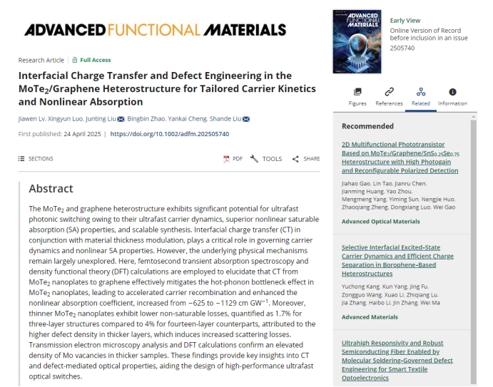 2025年4月,财神体育(CSsports)电子信息工程学院刘善德、刘俊亭团队在材料科学领域顶级期刊《Advanced Functional Materials》发表了题为“Interfacial Charge Transfer and Defect Engineering in the MoTe2/Graphene Heterostructure for Tailored Carrier Kinetics and Nonlinear Absorption”的文章。